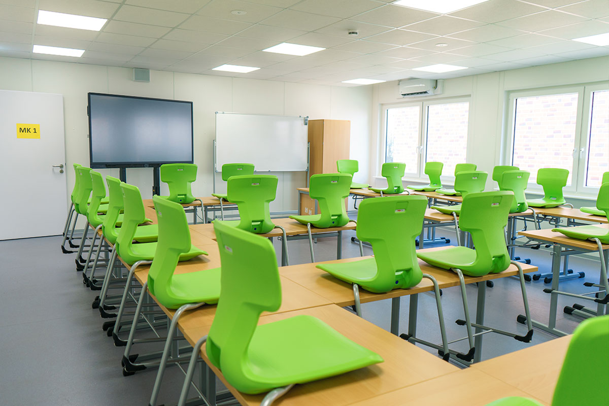 - Standard-Klassenraum: Bewährter Grundriss, robuste Oberflächen, zügige Lieferung.