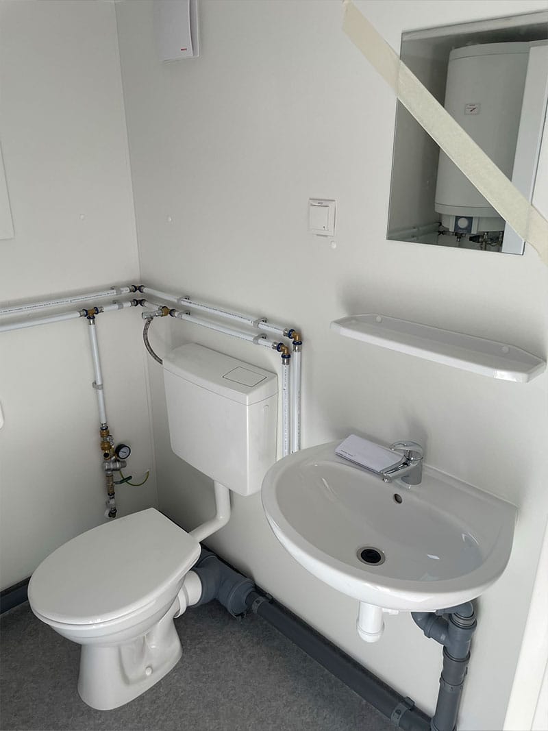Kombination aus Aufenthaltsraum und integrierter Sanitärlösung – ideal für Baustellen, Betriebshöfe oder temporäre Einsatzorte.